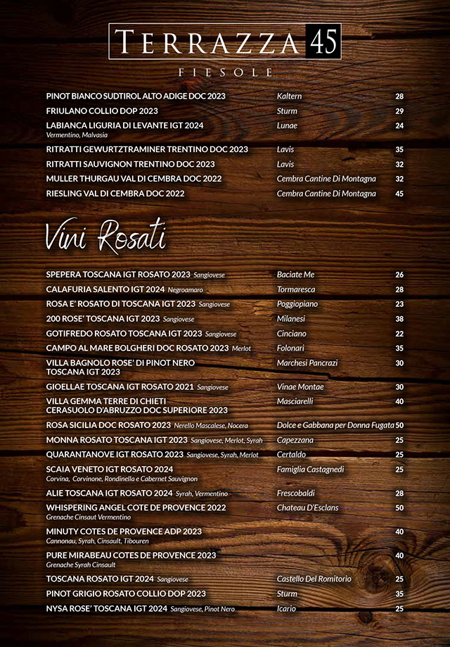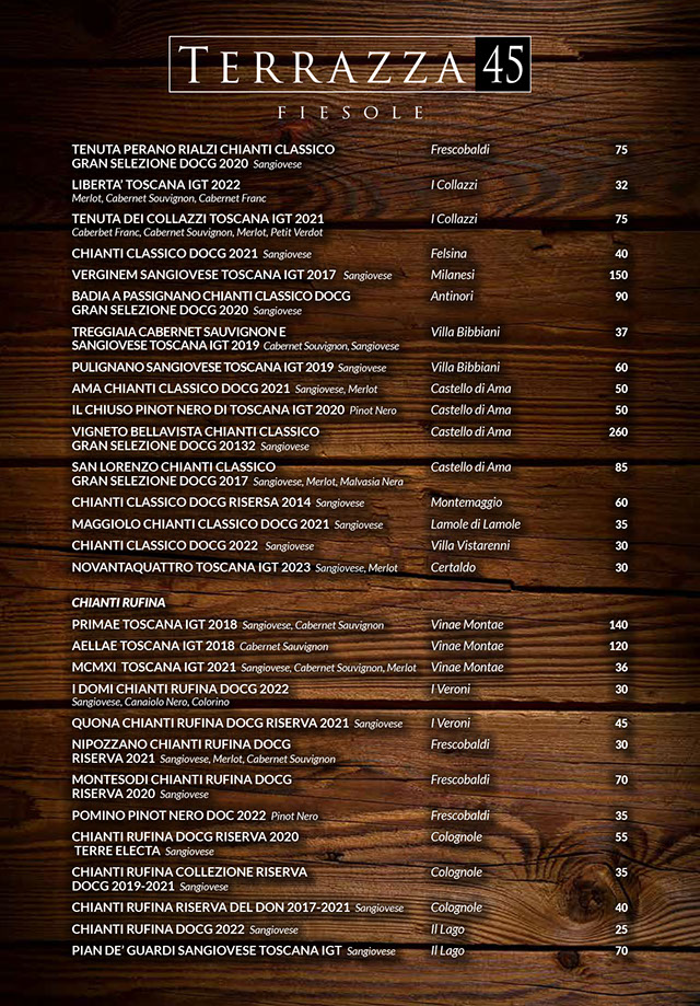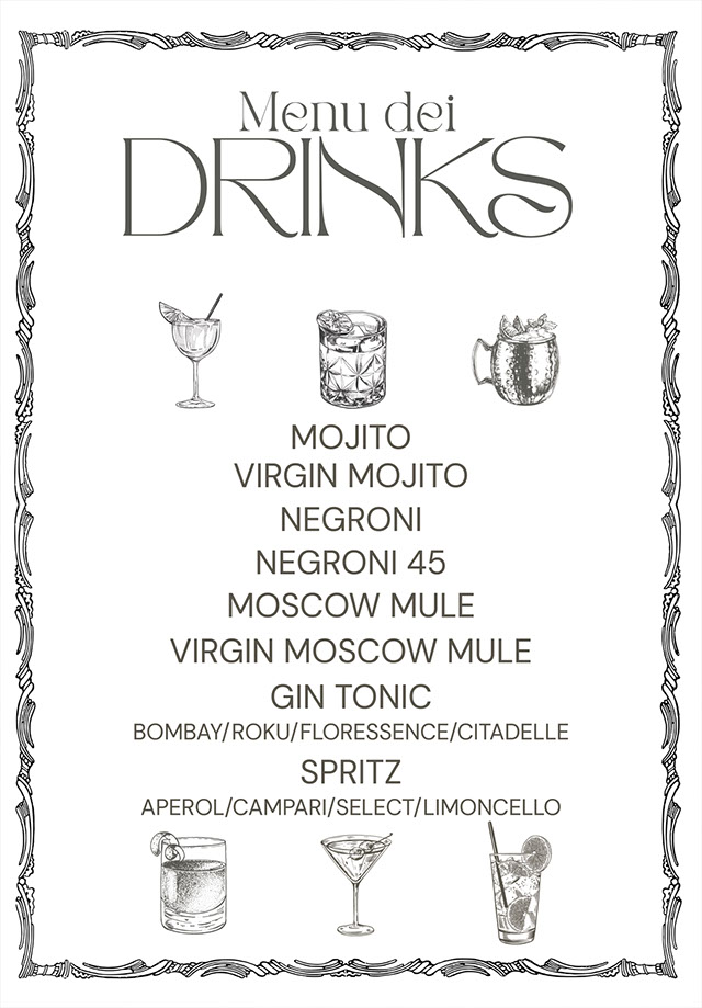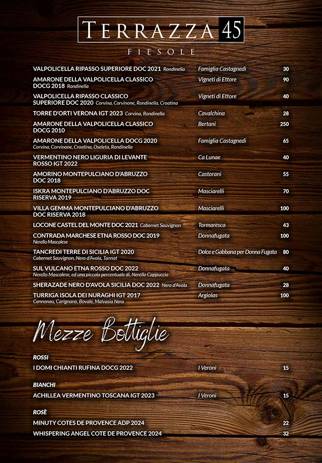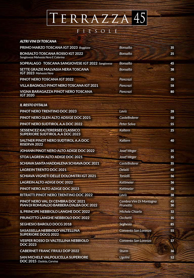 E non manca una vasta scelta di vini, fra i migliori che offre la terra italiana.