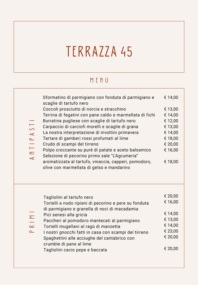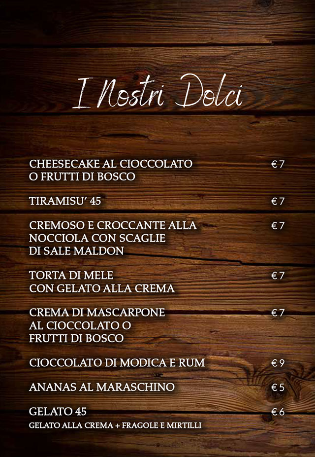 Il nostro menu’ e’ incentrato sulla ricerca dei migliori prodotti in termini di freschezza e qualità per offrire ai nostri clienti il meglio sul mercato. Proponiamo piatti di carne e di pesce sia cotti che le nostre tartare di carne e gamberi rosa, passando per la nostra bistecca di Scottona alla fiorentina.